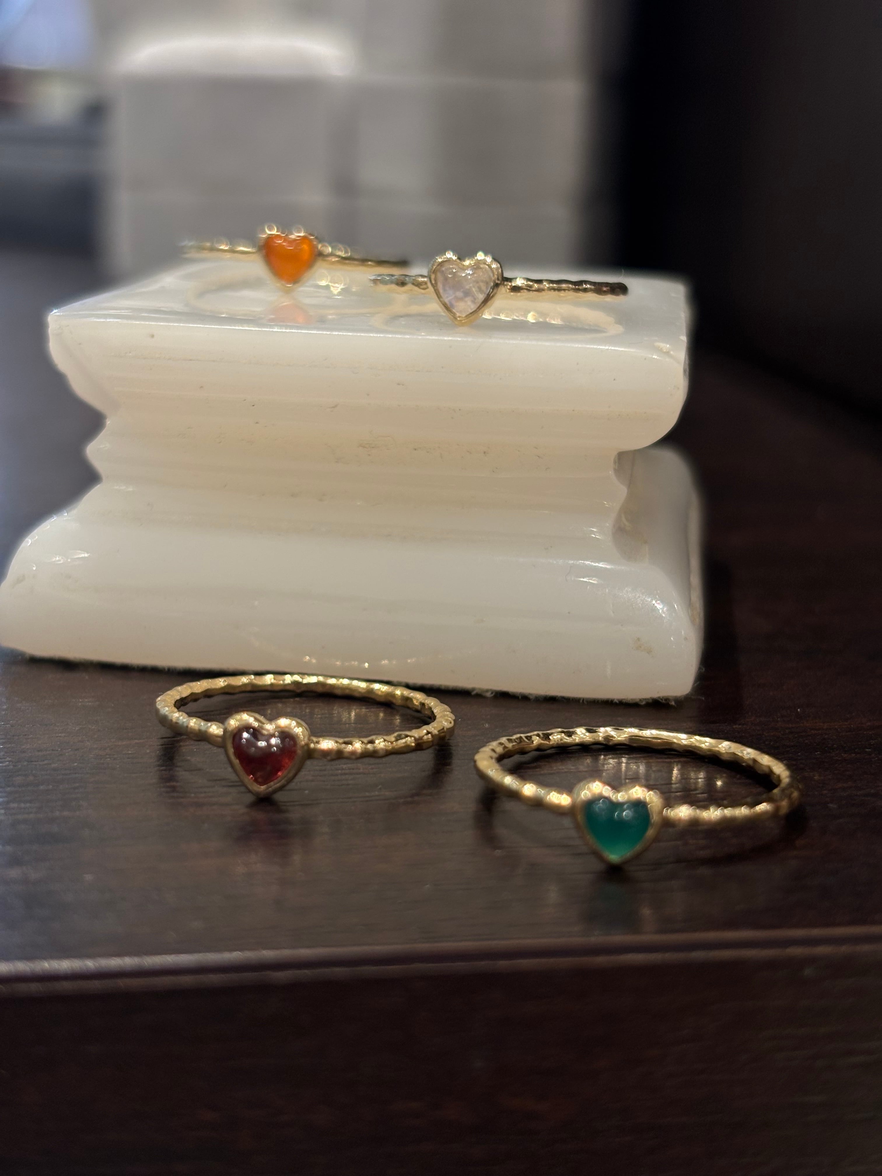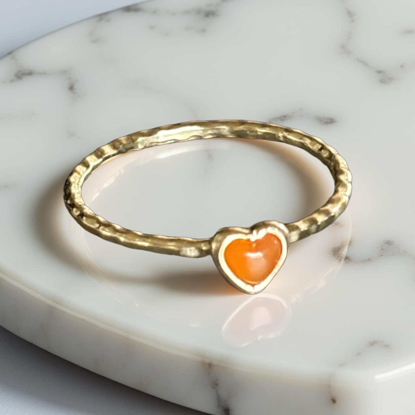 愛らしいハート型が輝く、特別なリング。カーネリアンを使用したオレンジのデザインは、シンプルでありながら、その明るい色合いが醸し出す温かみと活力が魅力です。このリングは、指元に控えめながらも印象的な存在感を与え、さまざまなスタイルに自然に調和します。