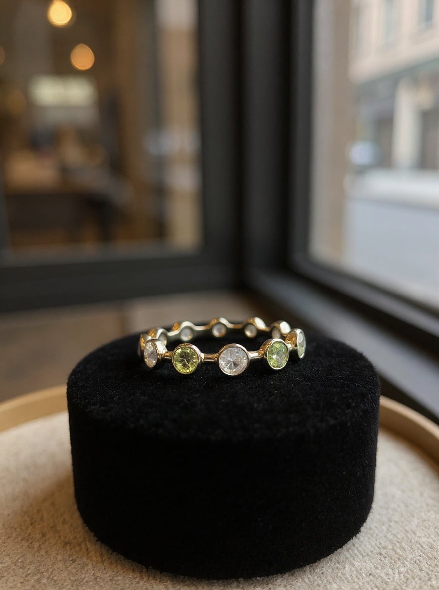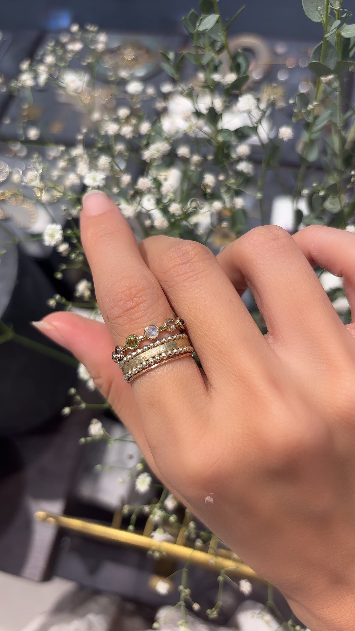 色とりどりの宝石が輝く、特別なリング。ラブラドライト、アメジスト、シトリン、ムーンストーン、ブルートパーズ、ペリドットなど、12種類の石を使用した囲うようなデザインは、シンプルでありながら、その多様な色合いが魅力的です。このリングは、指元に華やかな存在感を与え、さまざまなスタイルに自然に調和します。