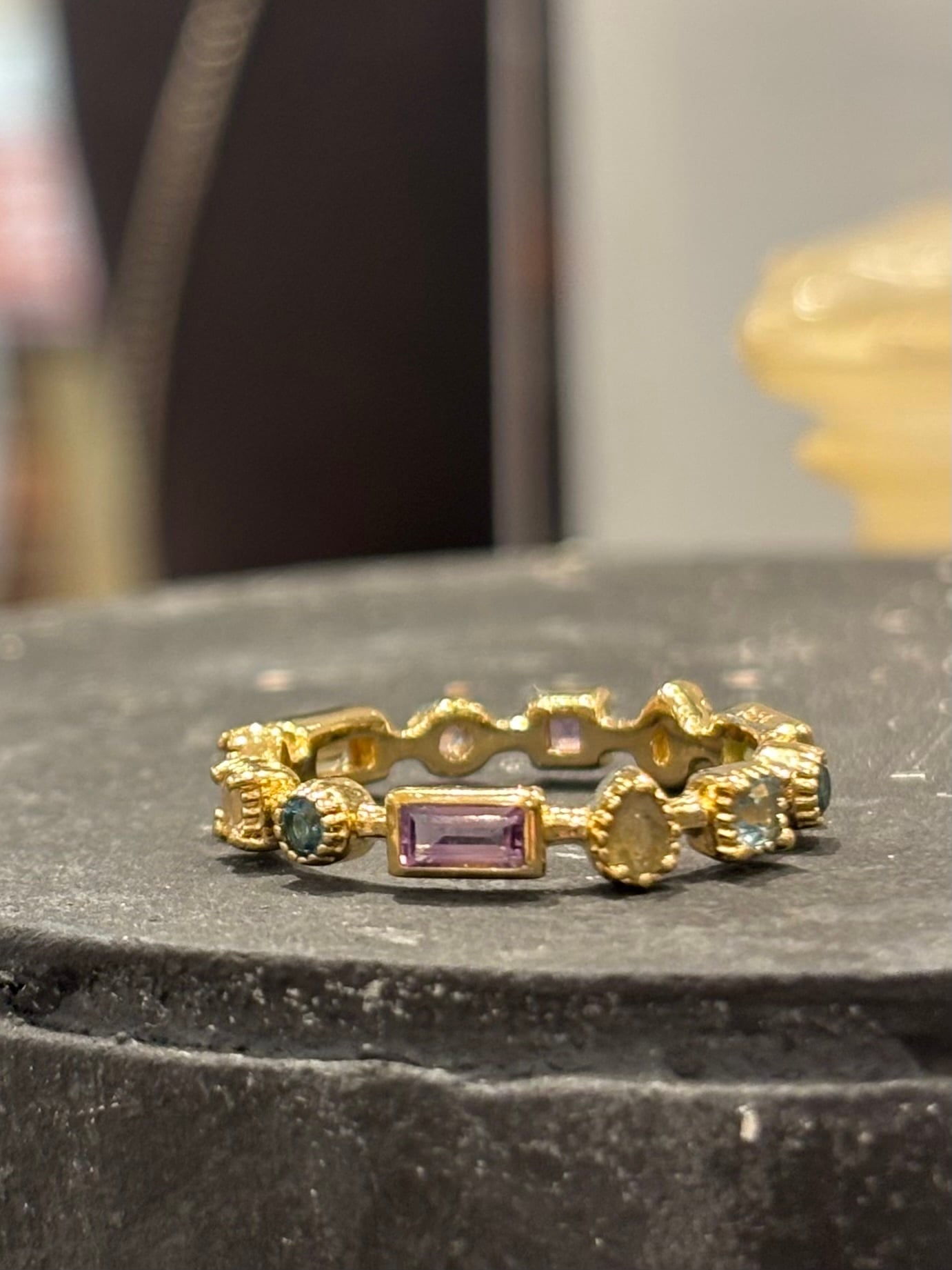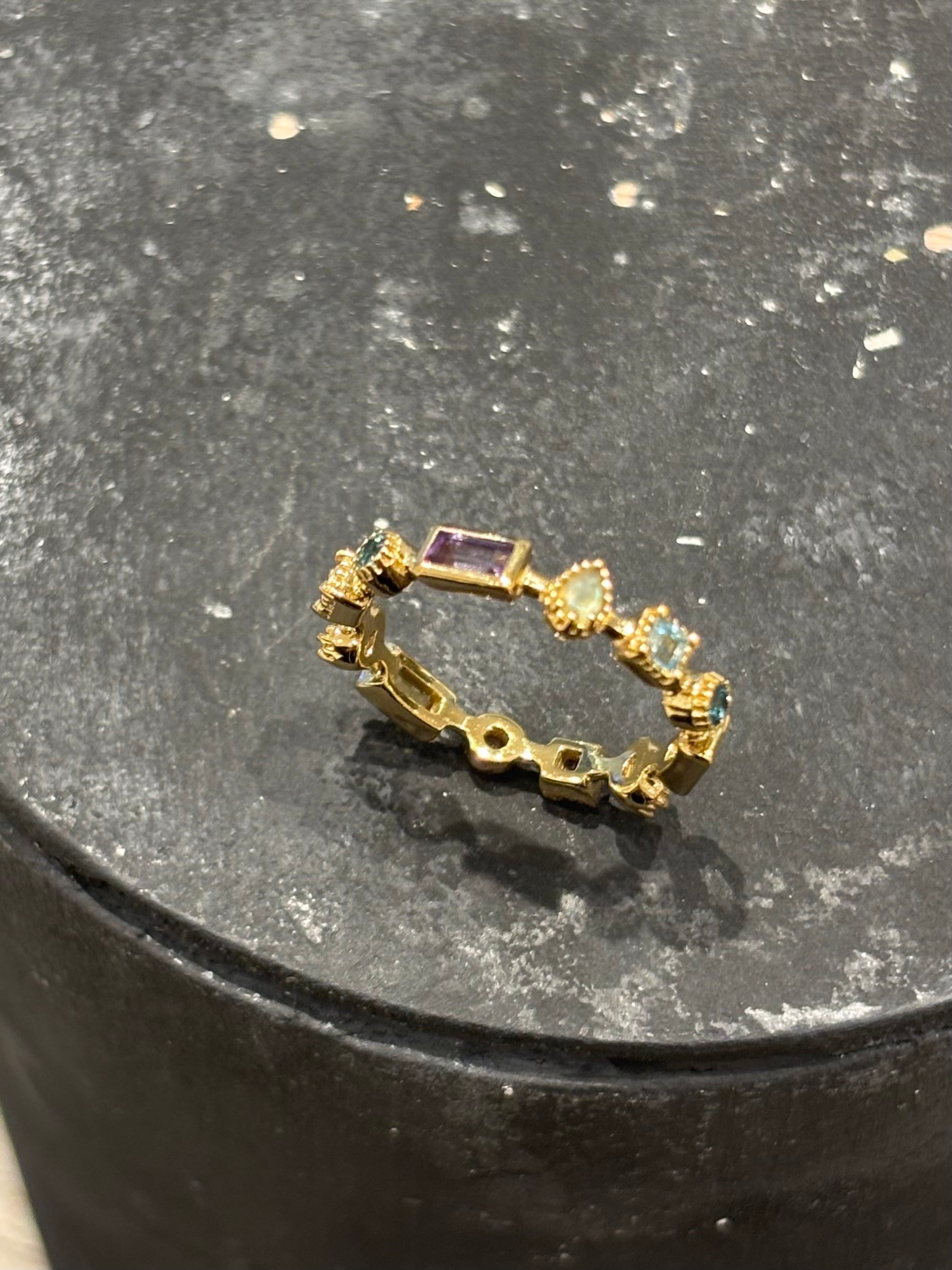 多彩な色合いが魅力の、特別なリング。ラブラドライト、アメジスト、シトリン、ムーンストーン、ブルートパーズ、ペリドット、アクアマリンを贅沢にあしらったデザインは、その可愛い石枠と洗練された印象が特長で、指元に華やかなアクセントを加えます。このリングは、さまざまなスタイルに自然に調和し、あなたの魅力を引き立てます。