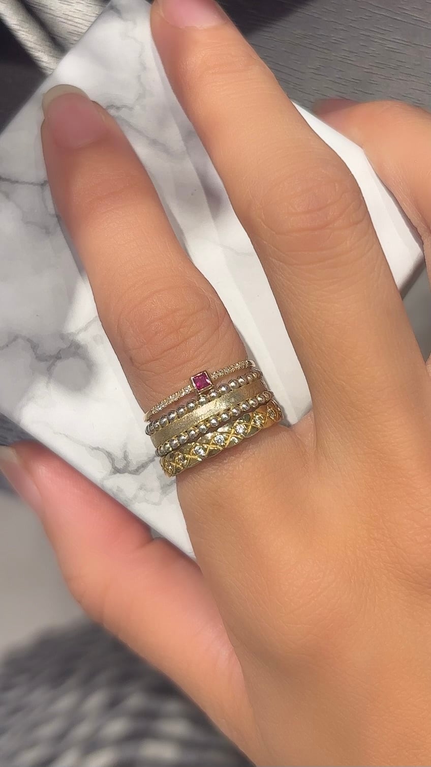 華やかなルビーとダイヤモンドのコントラストが魅力の、特別なK14 ダイヤとルビーリング。艶やかなナチュラルダイヤを取り囲むようにスクエアのルビーが配置され、指元に洗練された印象を与えます。このリングは、さまざまなスタイルに自然に調和し、あなたの魅力を一層引き立てるアイテムです。