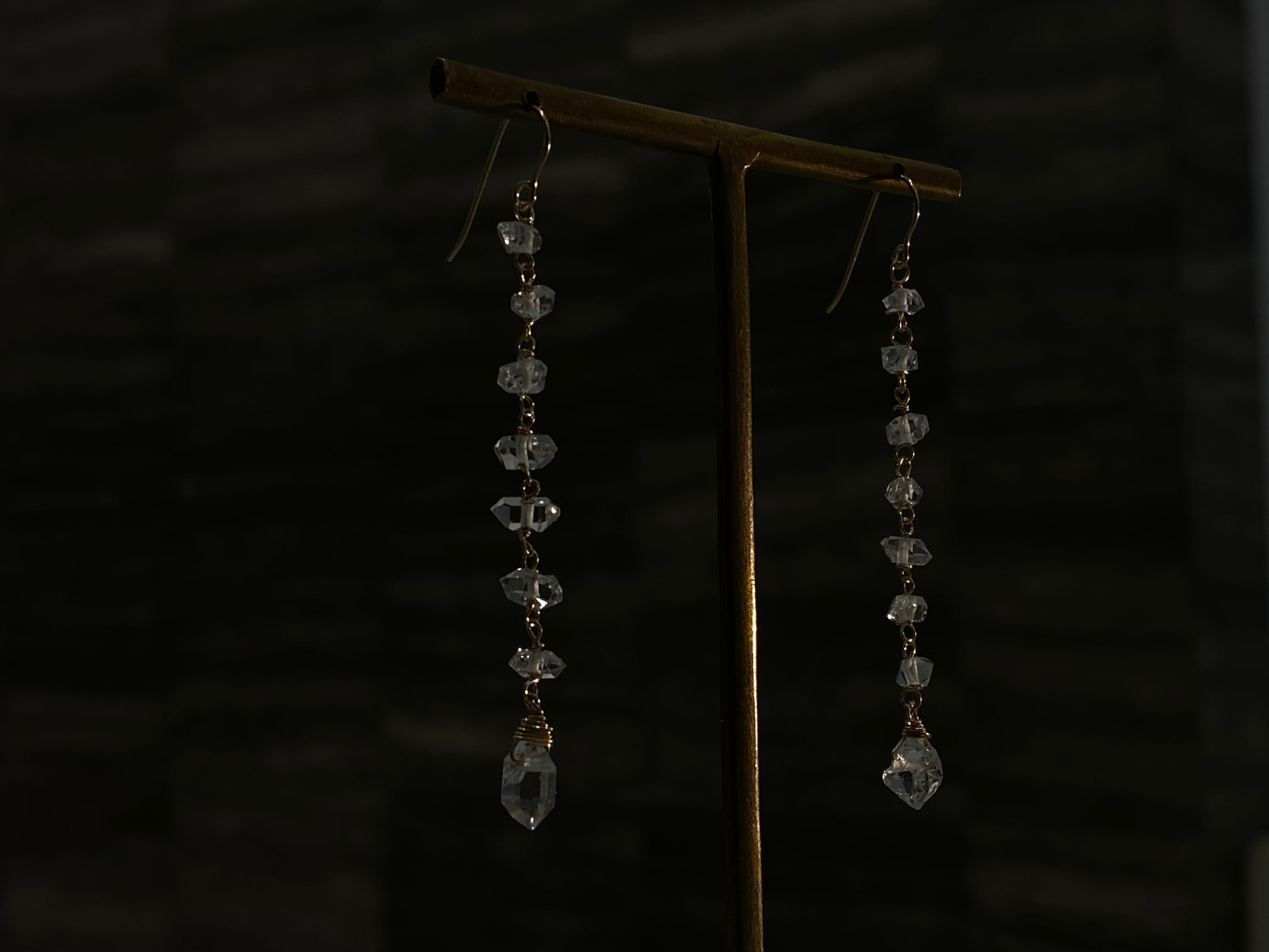 きらっきらのハーキマーダイヤモンドがチラチラといっぱいついたロングピアスです。