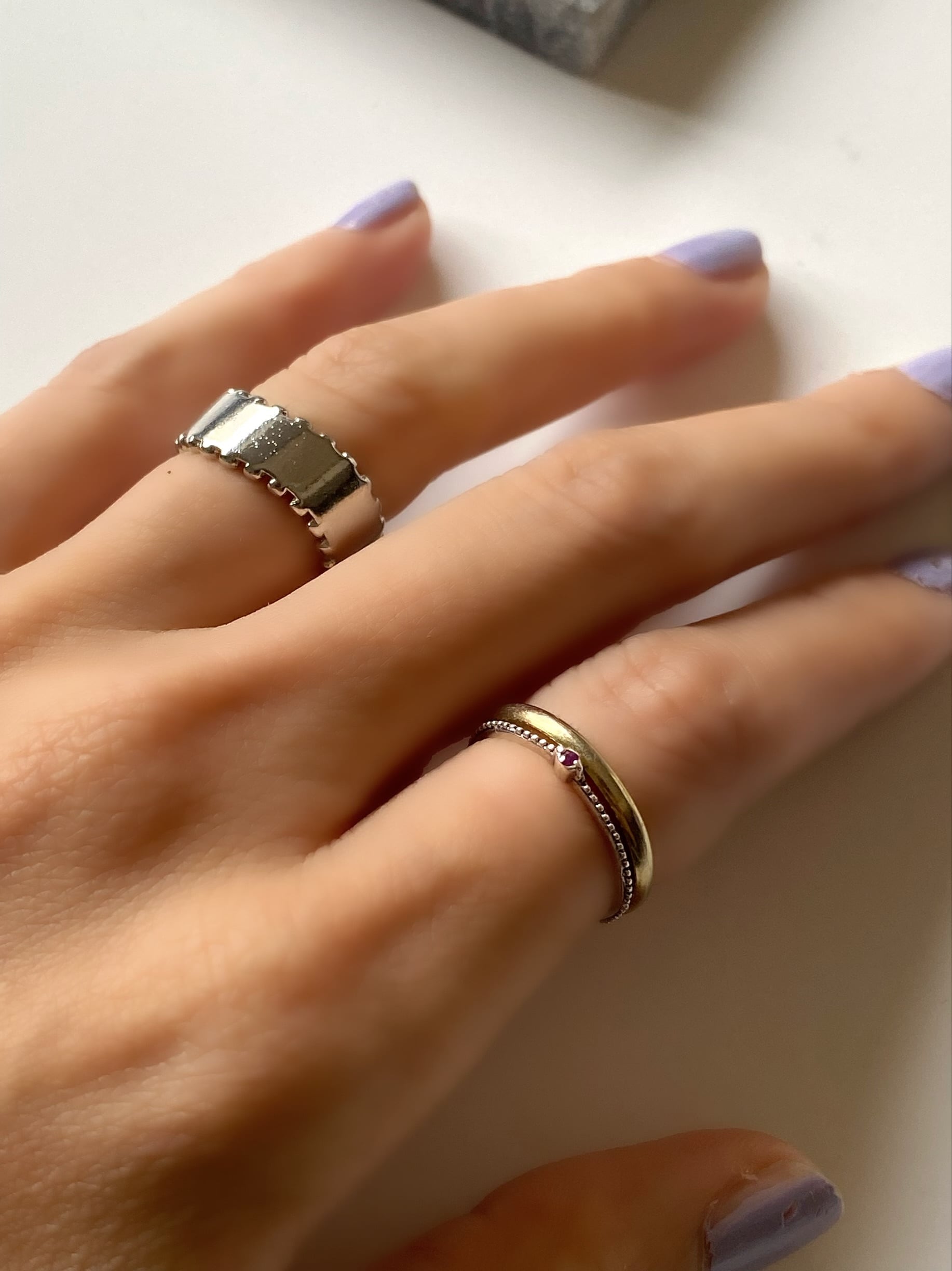 手作りの温かみを感じさせるこのリングは、職人がひとつひとつ丁寧に作り上げました。シンプルながらも遊び心があるデザインは、着けるだけで気分が上がります。ぷつぷつ模様は不規則に配置されており、シルバーの輝きが指元を引き立てます。