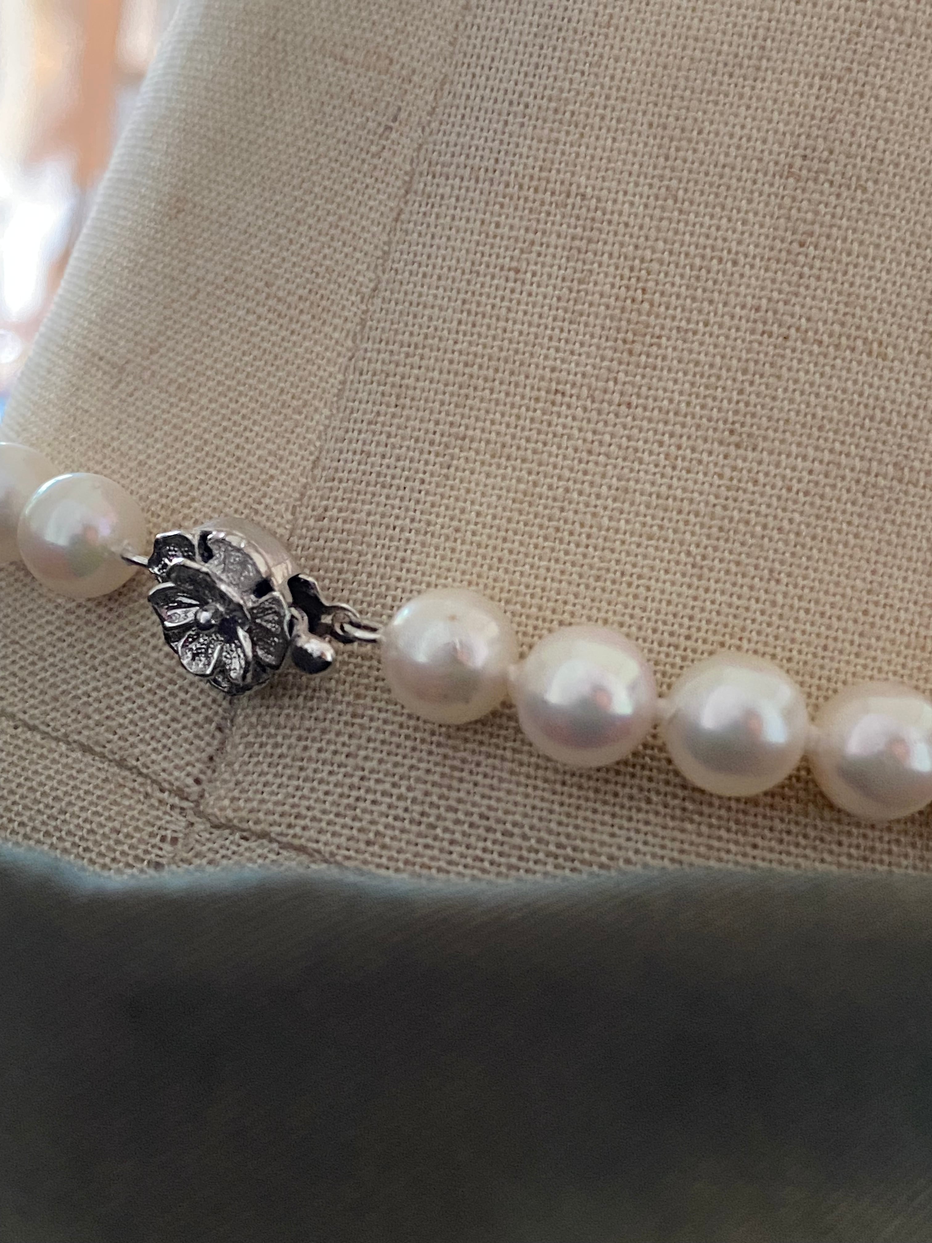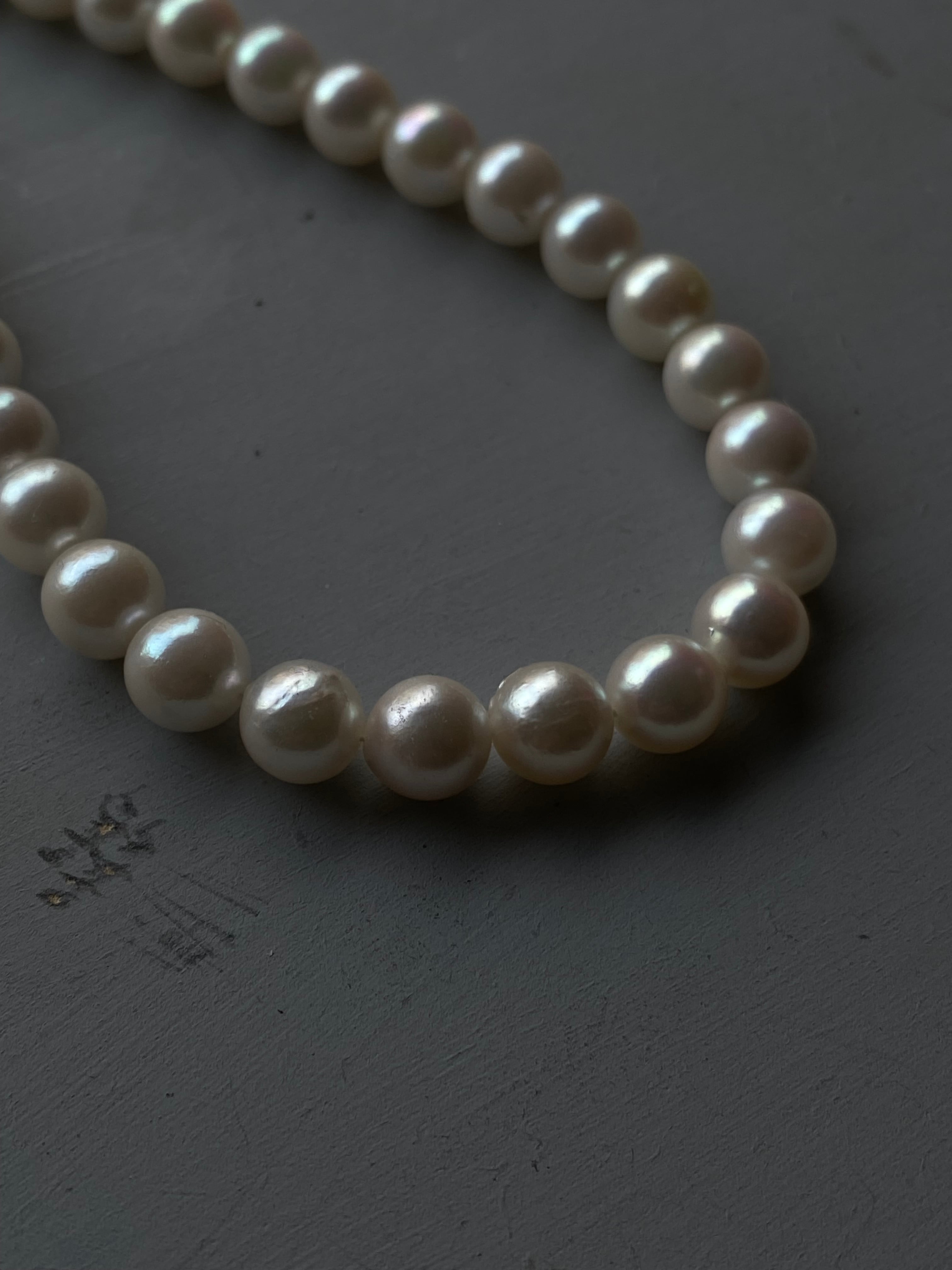 オールノット加工と言って、真珠と真珠の間に結び目を使って一つ一つ丁寧に繋げていく加工を施しています。その為、真珠同士が傷つきにくく、また万が一、切れたとしたら、普通の加工であれば、全て真珠が抜け落ちるのですが、そのようにバラバラと落ちることがありません。