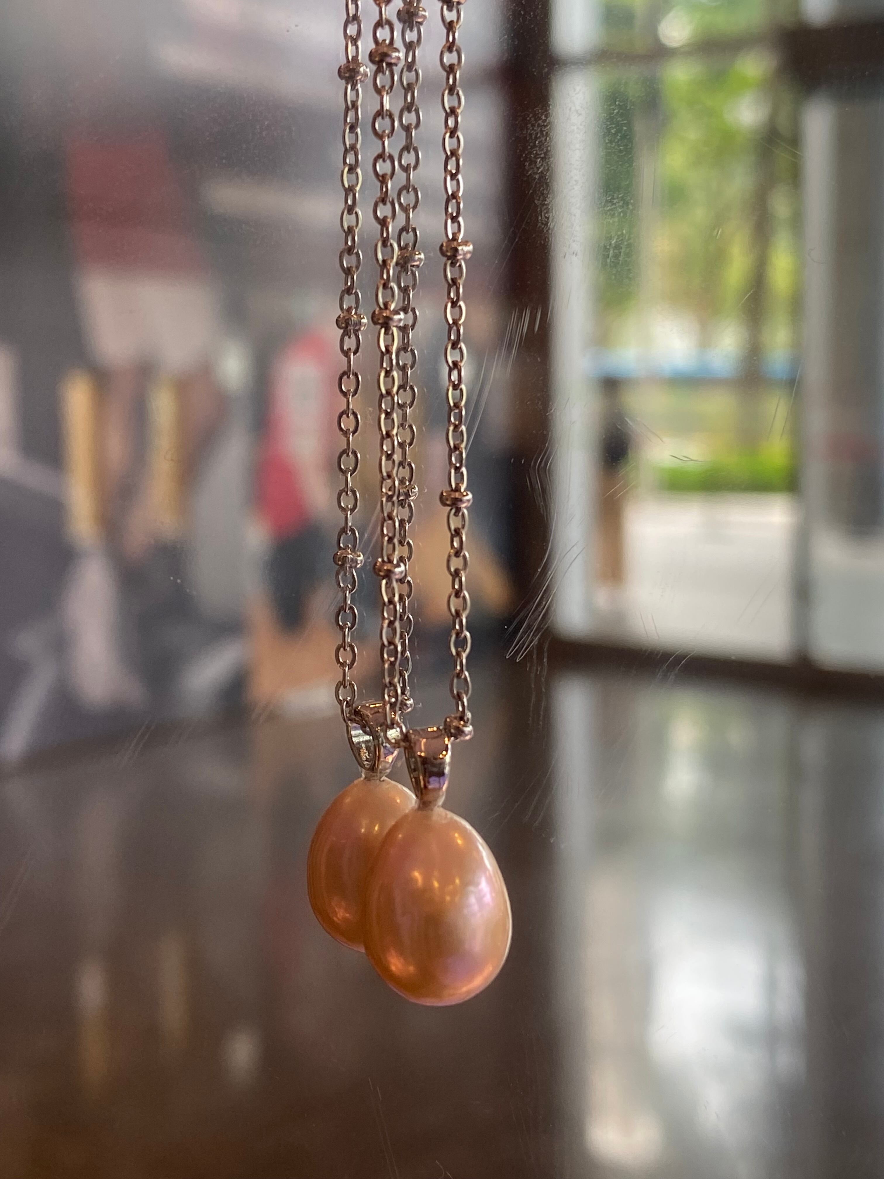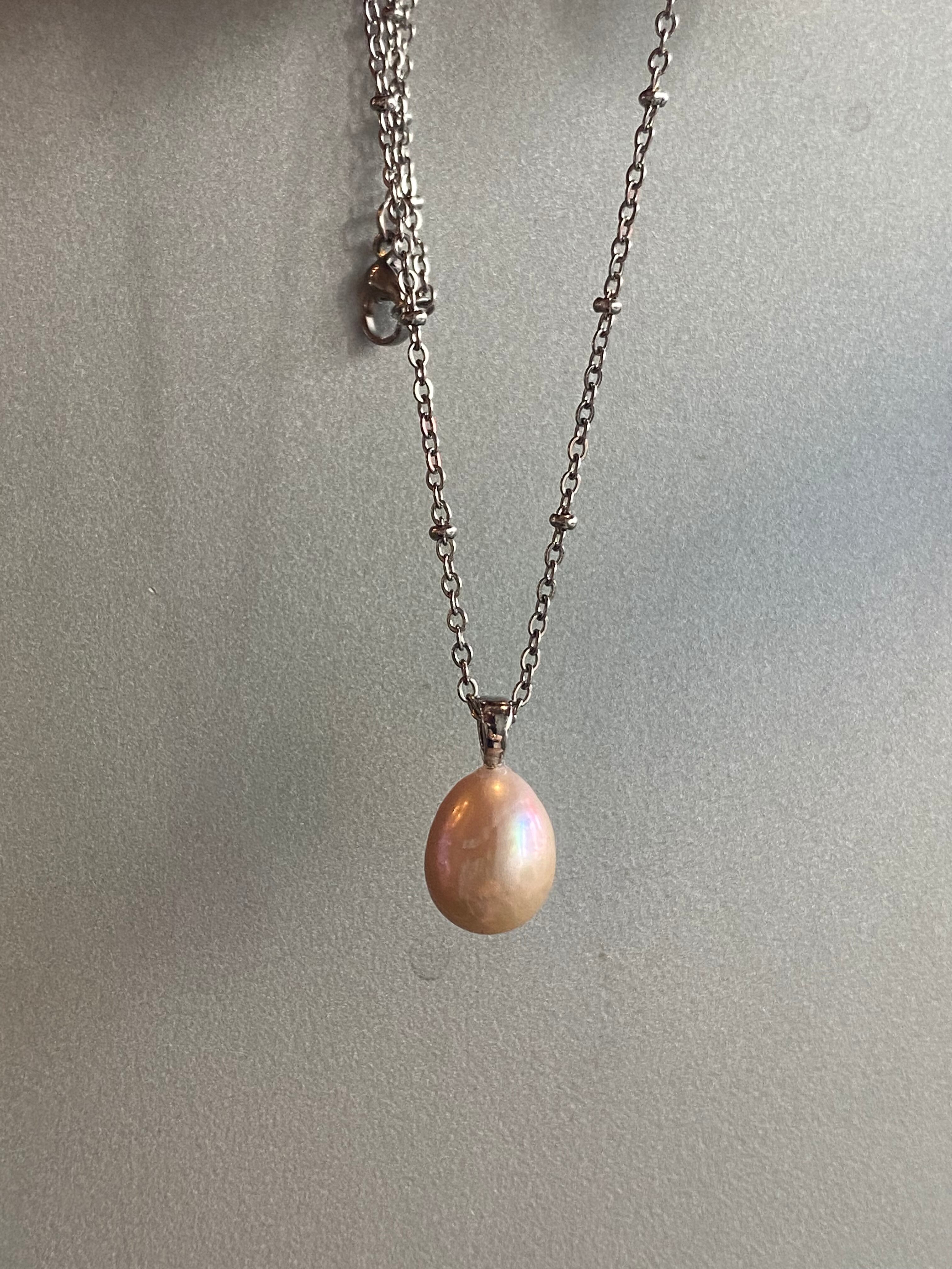 しるばーのつぶつぶチェーンに、14ミリの雫の淡水真珠が、女性らしさを引き立てる上品な輝きを放ちます。ピンク色の淡い真珠は、華やかさと可憐さを兼ね備えています。